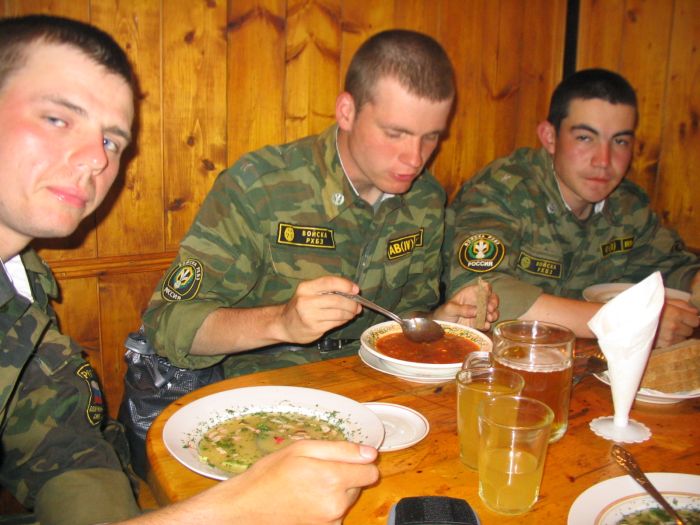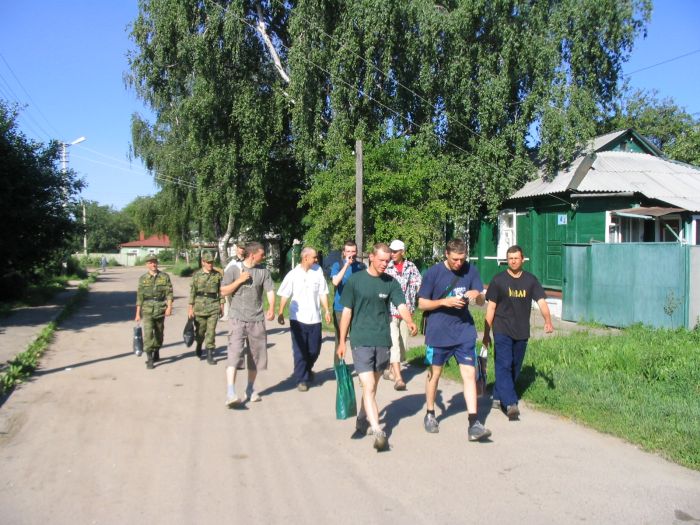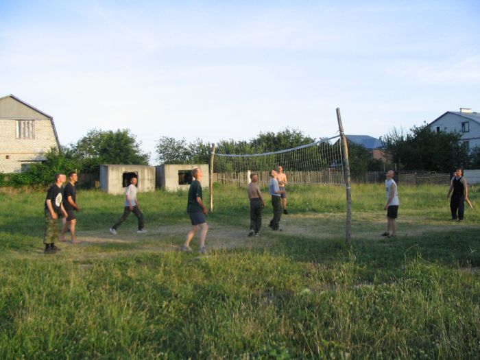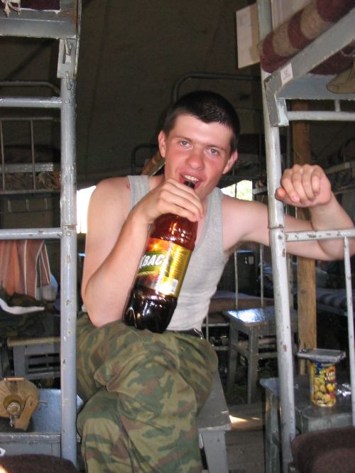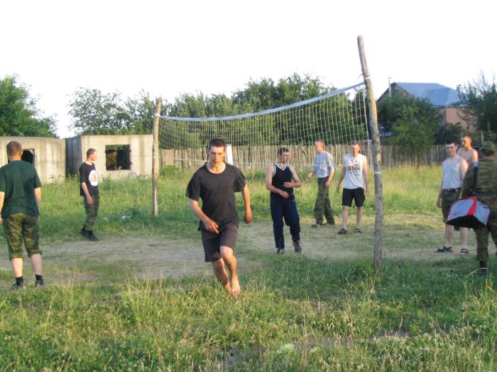 Купили Фасу в подарок плакат ЦСКА и налобный фонарик в главном универмаге. В соседнем магазе заметили продающиеся Л-1 и ОЗК, скорее всего какой-нибудь прапор решил подзаработать. Л-1 стоил 650 рублей, ОЗК 120. Потом зашли в какую-то кафешку и очень здорово поели. Сходили в городскую баню. До конца увала осталось несколько часов, но все идут в лагерь спать. Фас и Вовка бухают с Медведем, а я в это время играю в волейбол. На вечерней прогулке все расслабленные и веселые, поэтому вместо песни поют "лалала".
