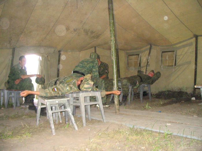 Как только пришли с обеда, нас запрягли разбирать кровати в палатках медиков и переносить их в другую. В итоге одна из палаток медиков превратилась во второй учебный класс. В палатке жило трое курсантов из Воронежа, которые приехали на повышение квалификации. Поплавский нашел карты в тумбочке у одного из них и демонстративно разорвал.