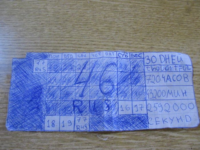 Заполнять дневник становиться лень. Антон Атоян сделал календарь с обратным отчетом оставшихся часов. По аналогии с дембельским обычаем "100 дней до приказа". Вечером началась сильная гроза. Молния попала в столб и теперь Медведь не мог зарядить кпк.
