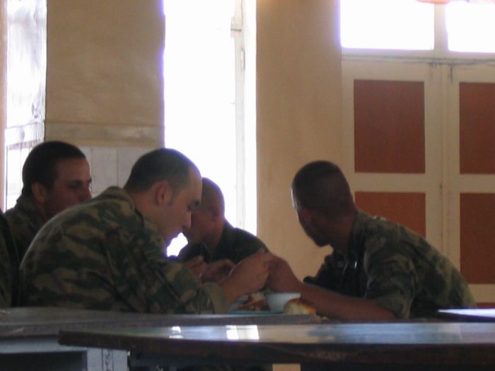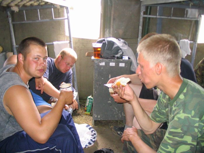 В увал не пошли, так как шел дождь. На завтрак многие забили. Все валялись в своих кроватях до 11. Я подал идею пройтись по стаканчику разливного пивка. Кто-то в шутку дал нам 5-ти литровую канистру. Мы подумали: а почему бы и нет?! Пролезли в дырку и зашли в первый магазин. Продавщица ошиблась и продала 5 литров разливного Пикура за 67 рублей, т.е в 2 раза дешевле. Тут все сразу расцветают. Мы с радости накупили сухариков и орешков на оставшиеся деньги.