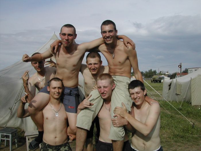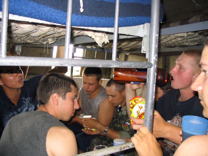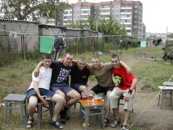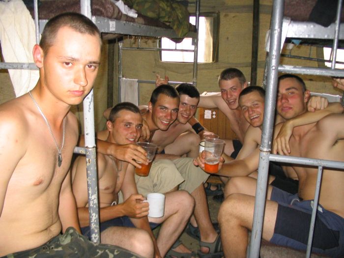 Выжрав эту канистру, отправились с тремя такими же канистрами в магазин. И тут до продавщицы дошло, что 15 литров пива не могут стоить 220 рублей. Она стала требовать с нас доплаты. Под возгласы "Еким, ты что, не доплатил?!" быстро сваливаем от туда. На выходе столкнулись с нашим прапором. Я притормаживаю на долю секунды, но ему уже все ясно. Однако, прапор был не из тех людей, которые выслуживаются перед начальством и ебут солдат за каждую провинность, поэтому он проходит мимо.